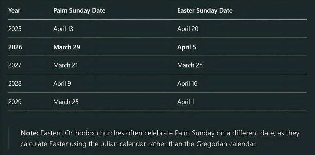 Palm Sunday in 2026 falls on March 29, 2026. Easter Sunday follows one week later, on April 5, 2026.